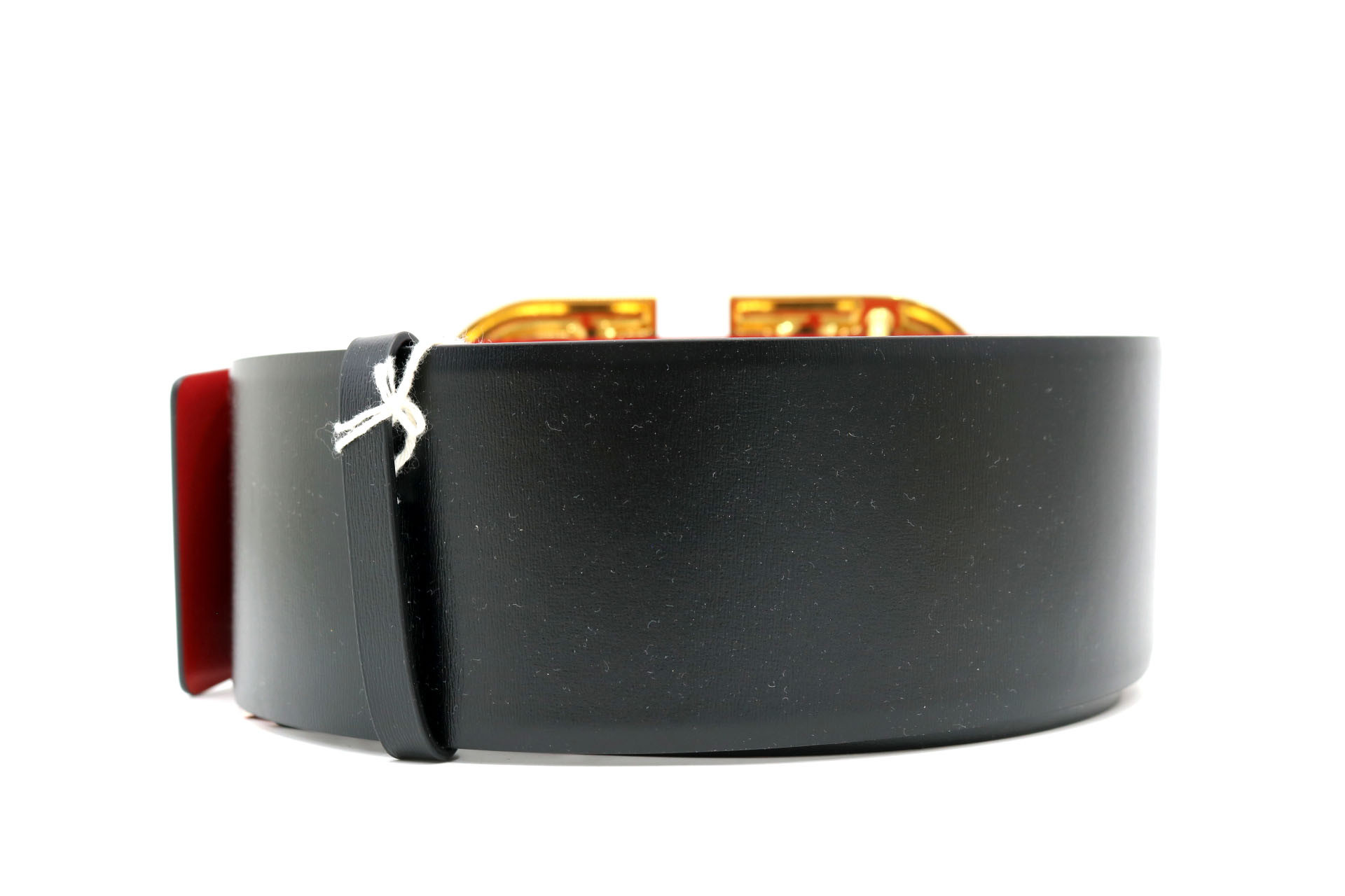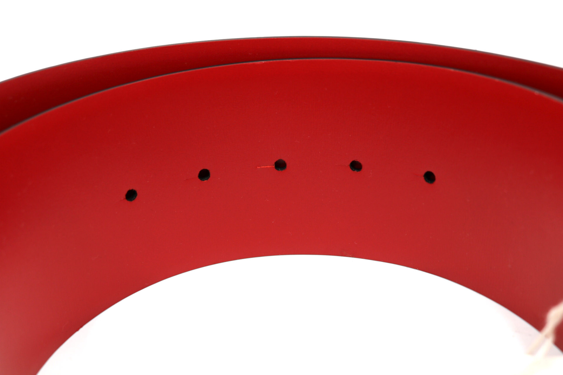 Composizione: pelle di colore nero e rosso / Accessori: metalici finitura oro / Misura: 80 x 7 cm / Stato: cintura in condizioni pari al nuovo
