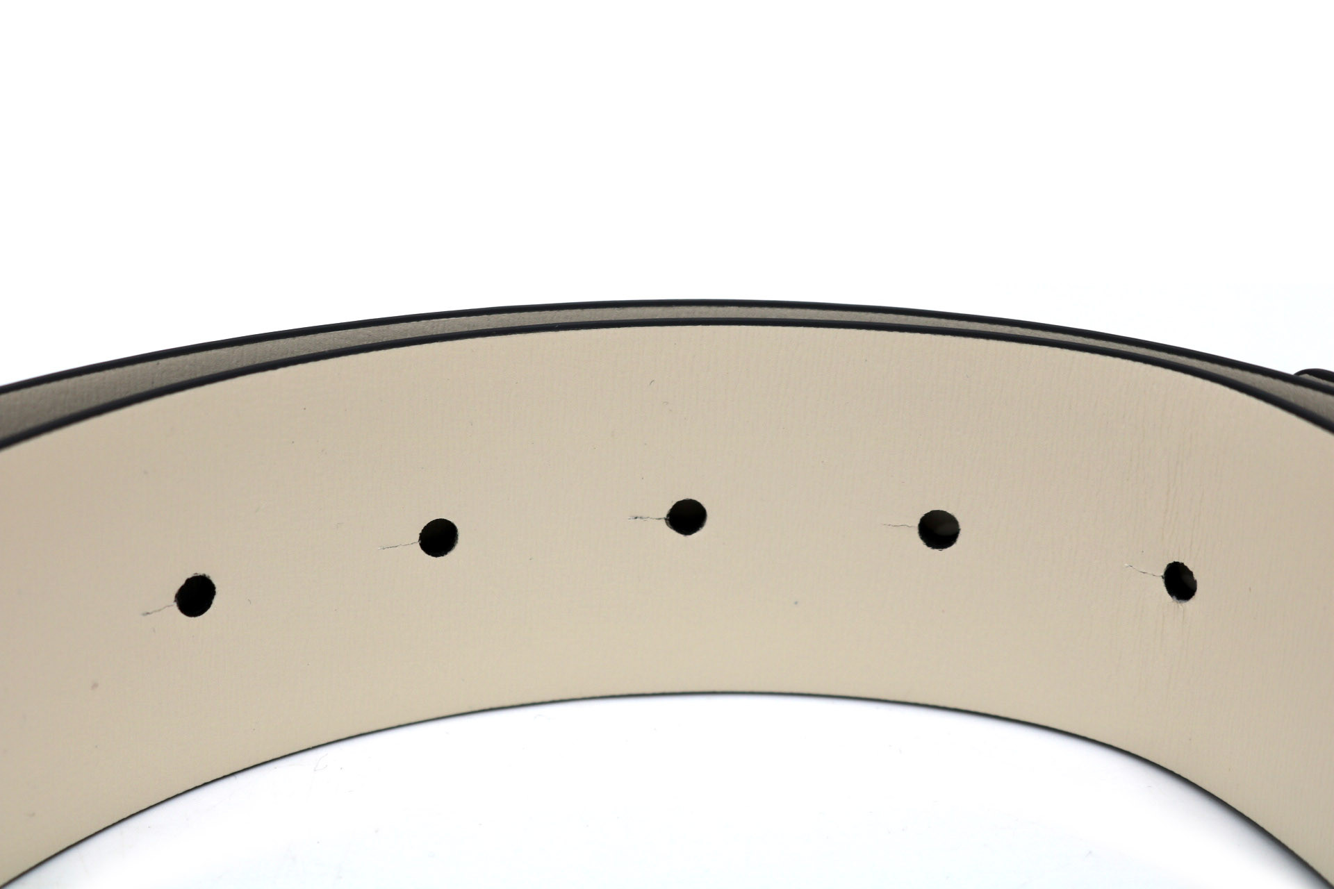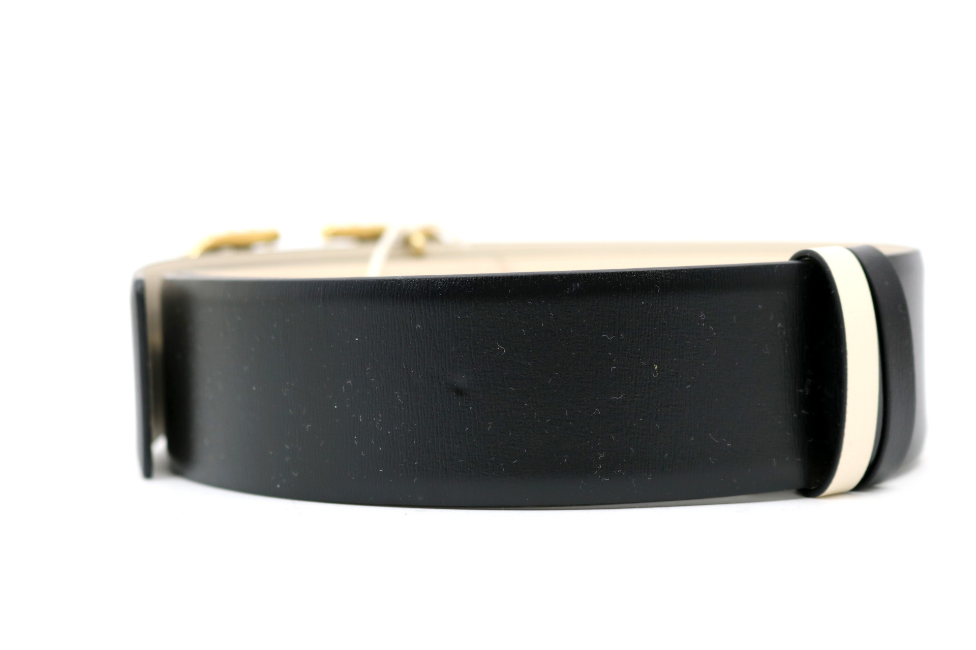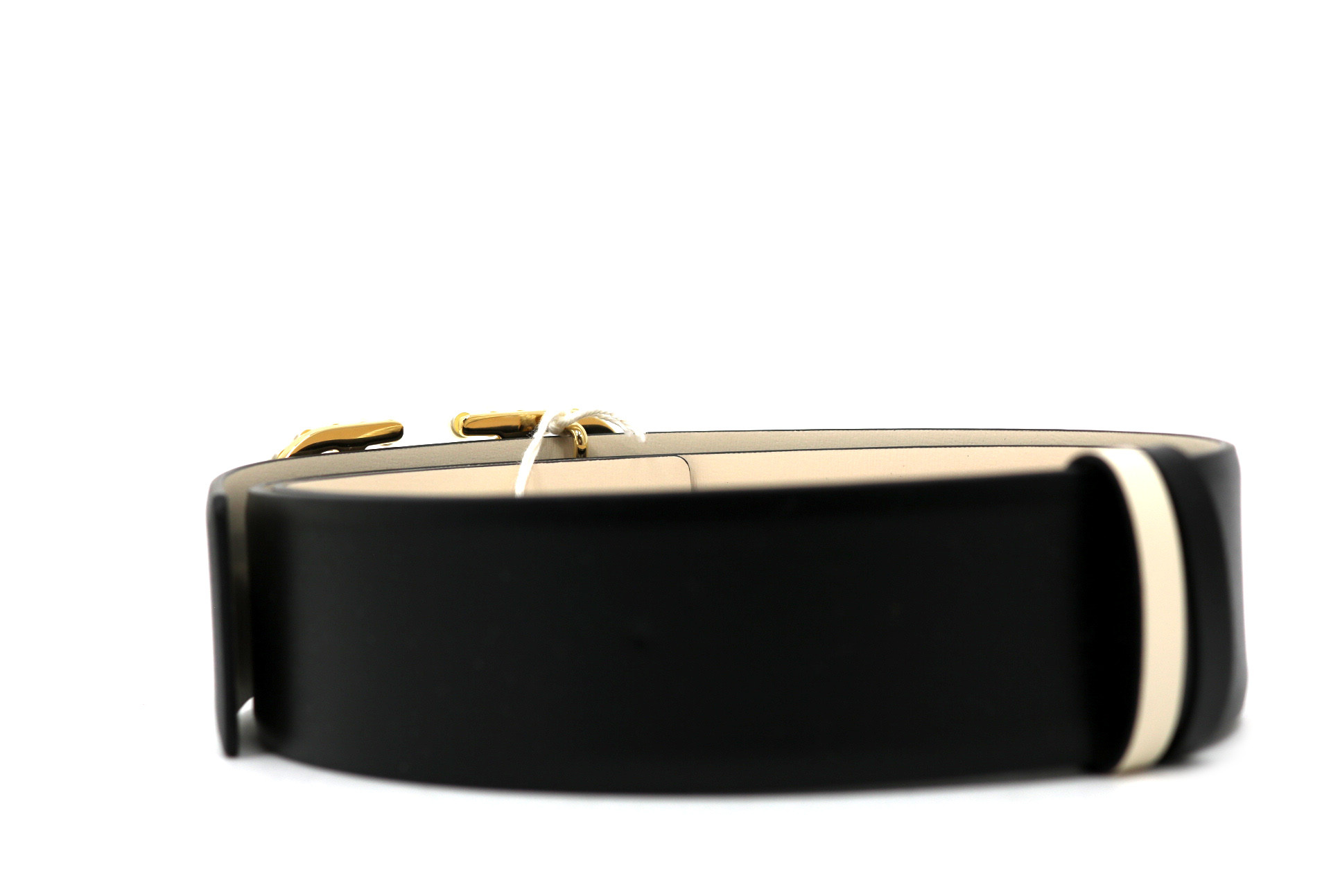 Composizione: pelle di colore nero / Accessori: metalici finitura oro / Misura: 85 x 4 cm / Stato: cintura in condizioni pari al nuovo
